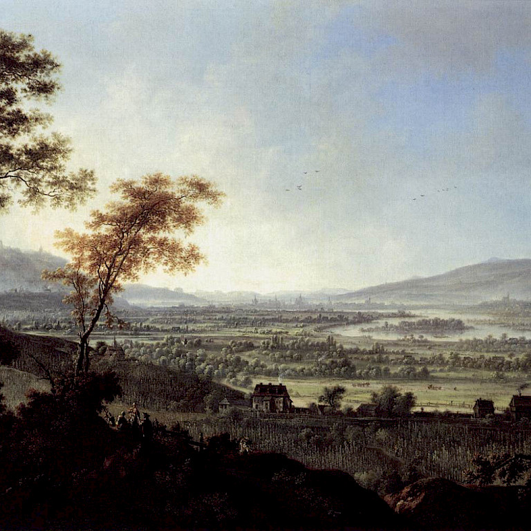 Wir nähern uns Dresden, begleitet von den Werken des Landschaftsmalers Johann Alexander Thiele. Auf der stark vergrößerten Kopie eines seiner Gemälde neben der Treppe geht der Blick von den Lößnitzhängen bei Radebeul flussaufwärts in das Elbtal. Die abwechslungsreiche Landschaft bot immer wieder Inspiration für Künstler wie Thiele und vor allem die Maler der Romantik.