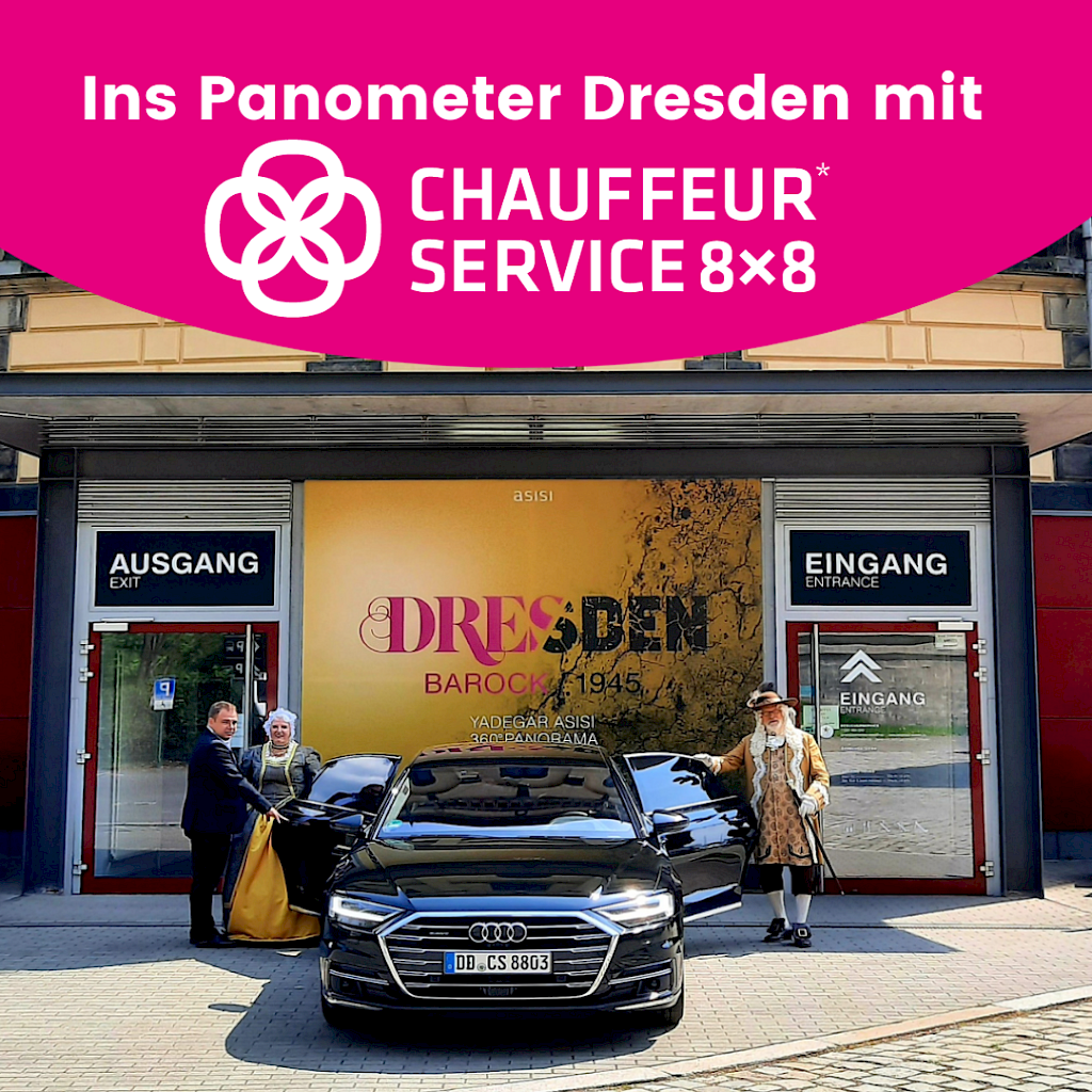 Unser Partner 8x8 bietet Ihnen professionelle Personenbeförderung auf höchstem Niveau. Sie buchen individuelle Mobilität, Ihnen werden maximaler Komfort, eine stets moderne Fahrzeugflotte sowie erfahrene Chauffeure geboten. Genießen Sie Ihren Aufenthalt im Panometer Dresden - ob in Familie, als Teamausflug oder bei einem der Konzerte, Vorträge oder Lesungen und lassen Sie sich dorthin chauffieren.